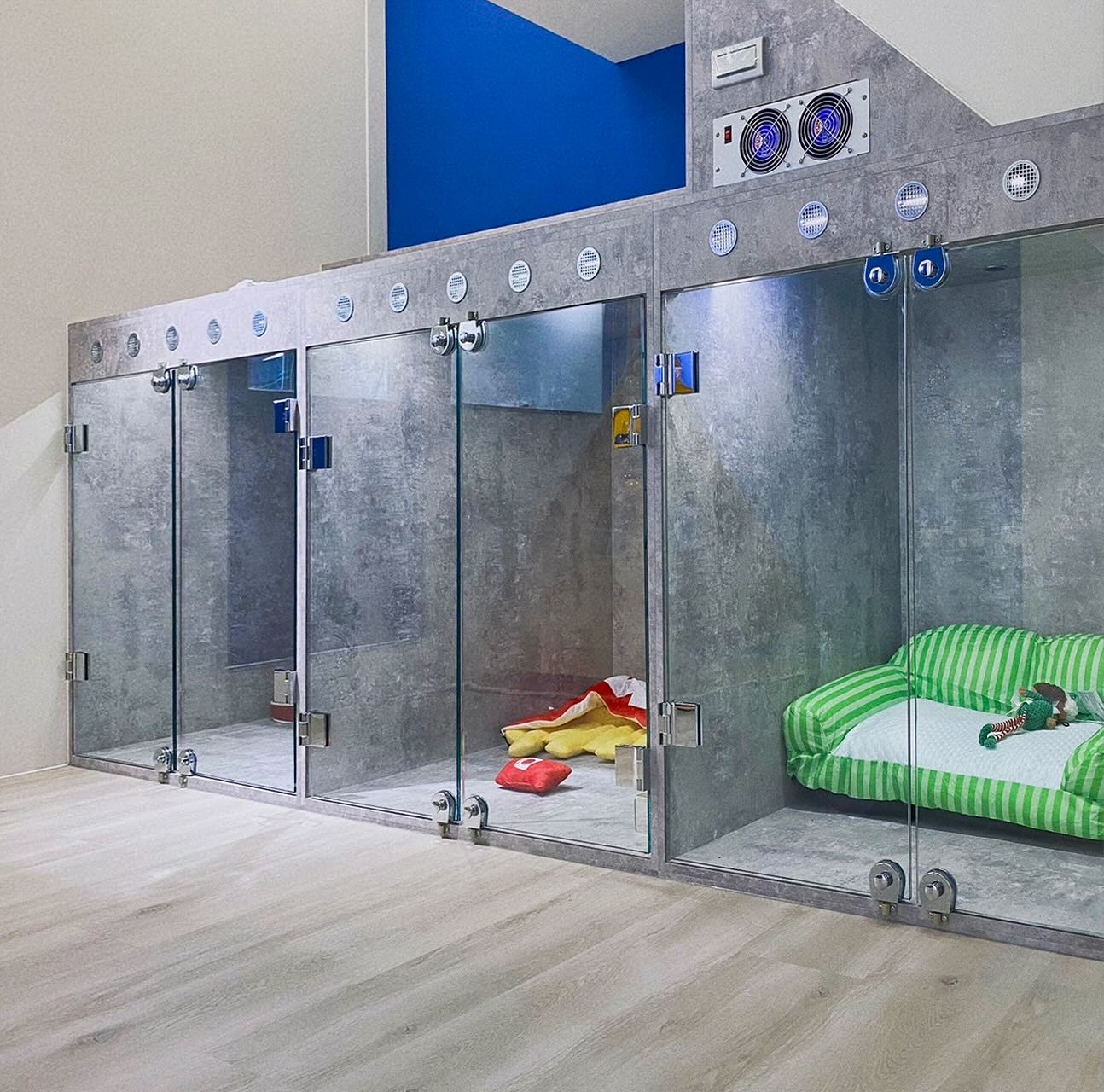 每一間房都是獨立區域,貓狗可以盡情地在裡面翻滾、伸懶腰或躺著休息。睡墊我們選用抗菌4D纖維可水洗材質,透氣、乾爽、減壓,每天都會換洗,讓毛孩睡起來既乾淨又舒服。